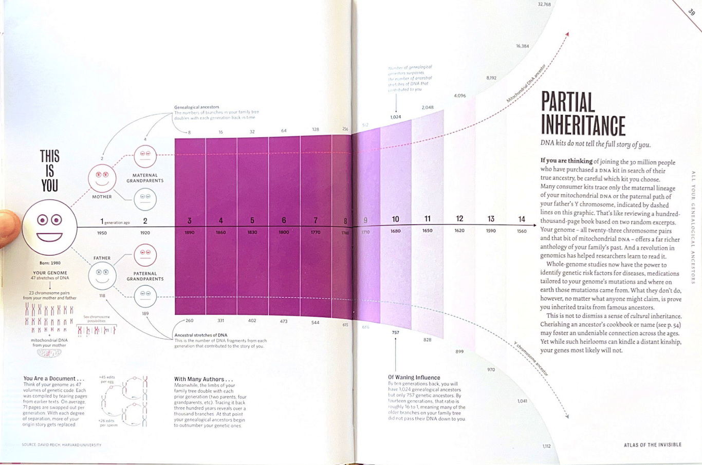 These genome contributions look promising at first. One hundred eighteen stretches of DNA vs two genealogical parents; 189 stretches of DNA vs four genealogical parents. But what our human mind misses is that the first grows exponentially while the second grows linearly.