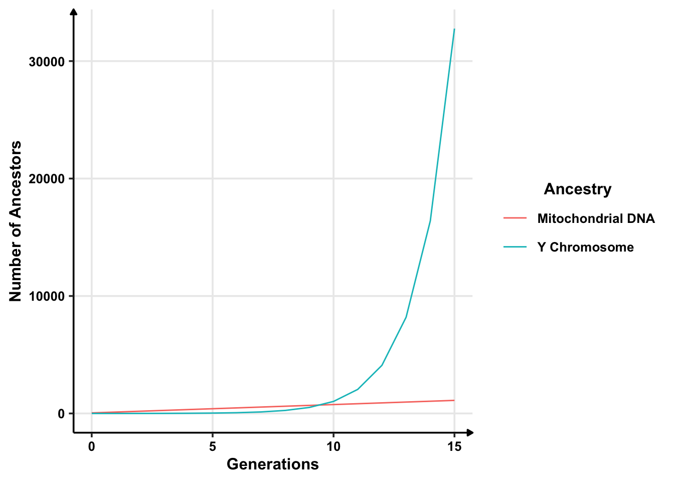 There are two ways to trace ancestry. First is genealogy, where you trace your family tree — like I tried. You build a chart of your parents, grandparents and so on. The graph would grow at an exponential rate in a normal situation: \(2^n\). Currently, I am at \(n = 0\). It’s only me. A generation before me would be two people, \(2^1\); a generation before them would be four people, \(2^2\), and so on.