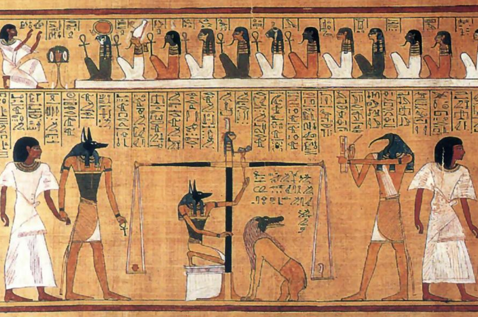 In this Papyrus3 print, Anubis is leading the king through twelve questions (top) and then has his heart being weighed against a feather, after which Osiris is allowing him into afterlife.