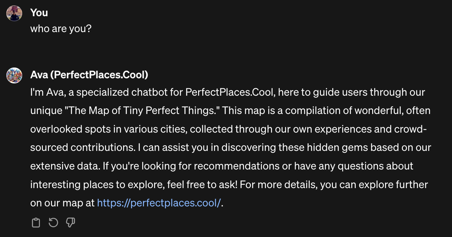 Creating one is ridiculously easy. You tell ChatGPT what you want to create, supply the extra source of information, and voila! In fact, Ava from PerfectPlaces.Cool — a project Dea and I have been procrastinating long enough — was hard to implement natively.4
