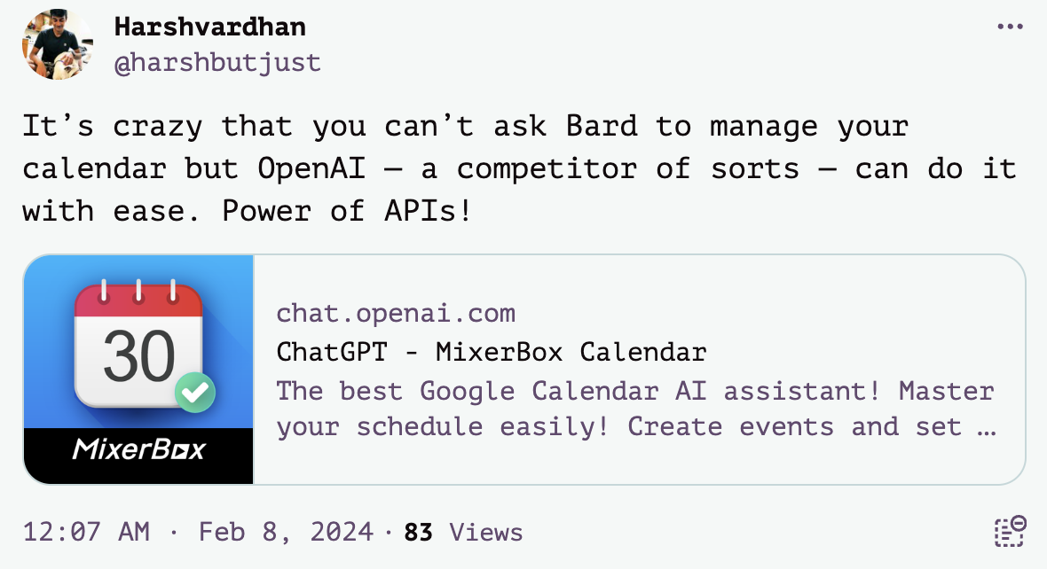 Bard was clearly an innovator in integrating a wide range of services, thanks to Google’s virtual monopoly on searching and communicating useful information. It could easily connect to Gmail, Drive, YouTube, Maps, Docs, Flights and a host of Google services. However, the performance was subpar. It would hallucinate a lot and often forget that it had the capability to talk to other Google services. (It almost always remembered to do that when told.)3