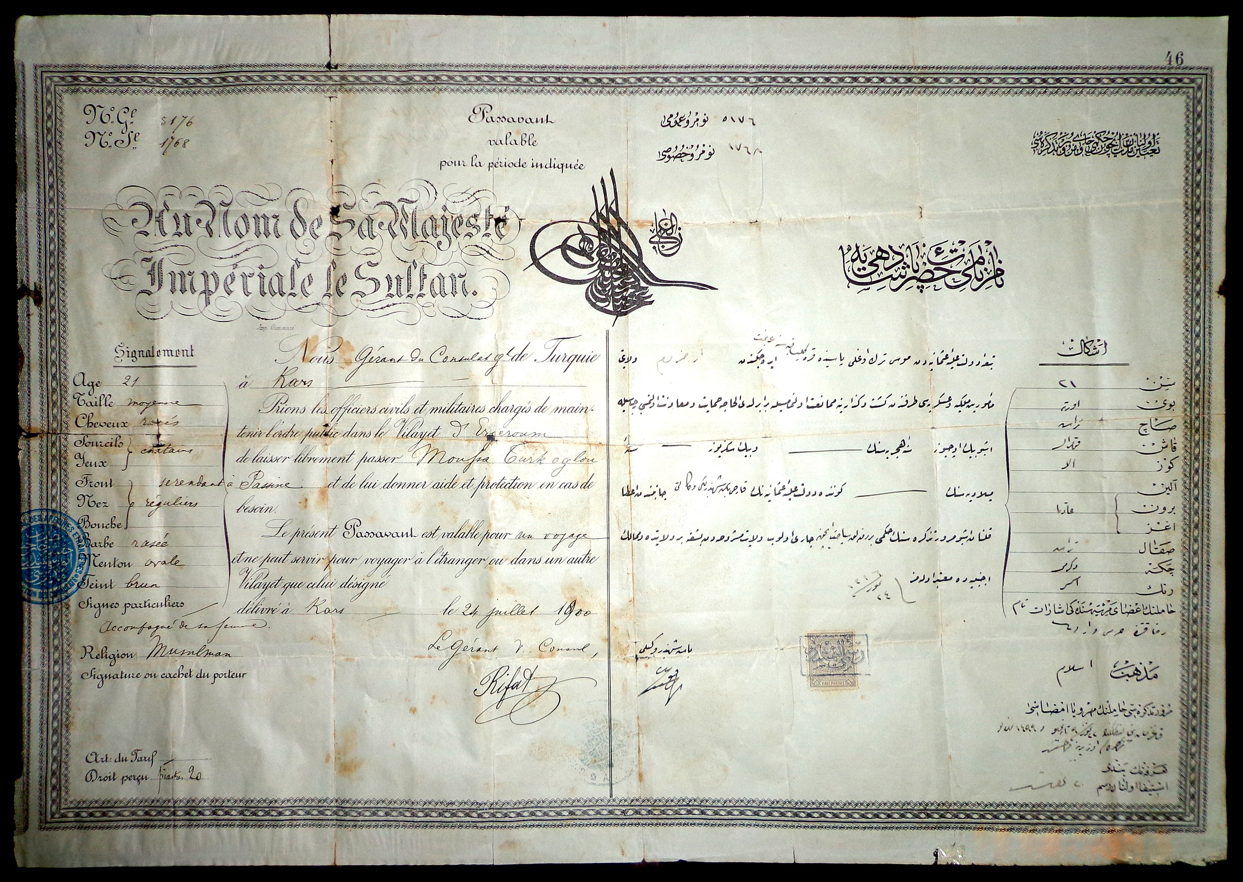 An Ottoman passport (passavant) issued to a Russian subject dated July 24, 1900