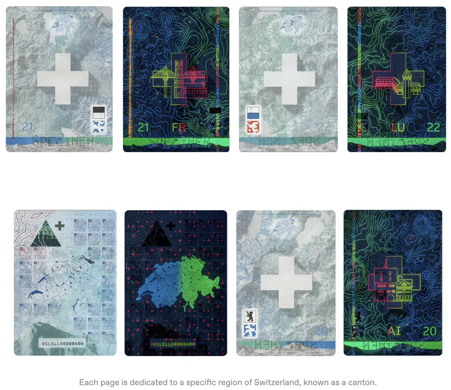 Switzerland’s passport shows each region’s topography map under UV light.