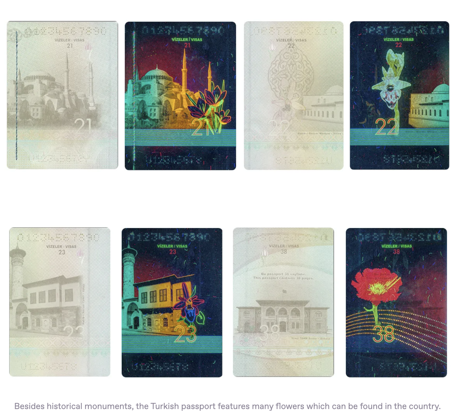 The Turkish passport includes local flowers under UV light and historical buildings under any light.