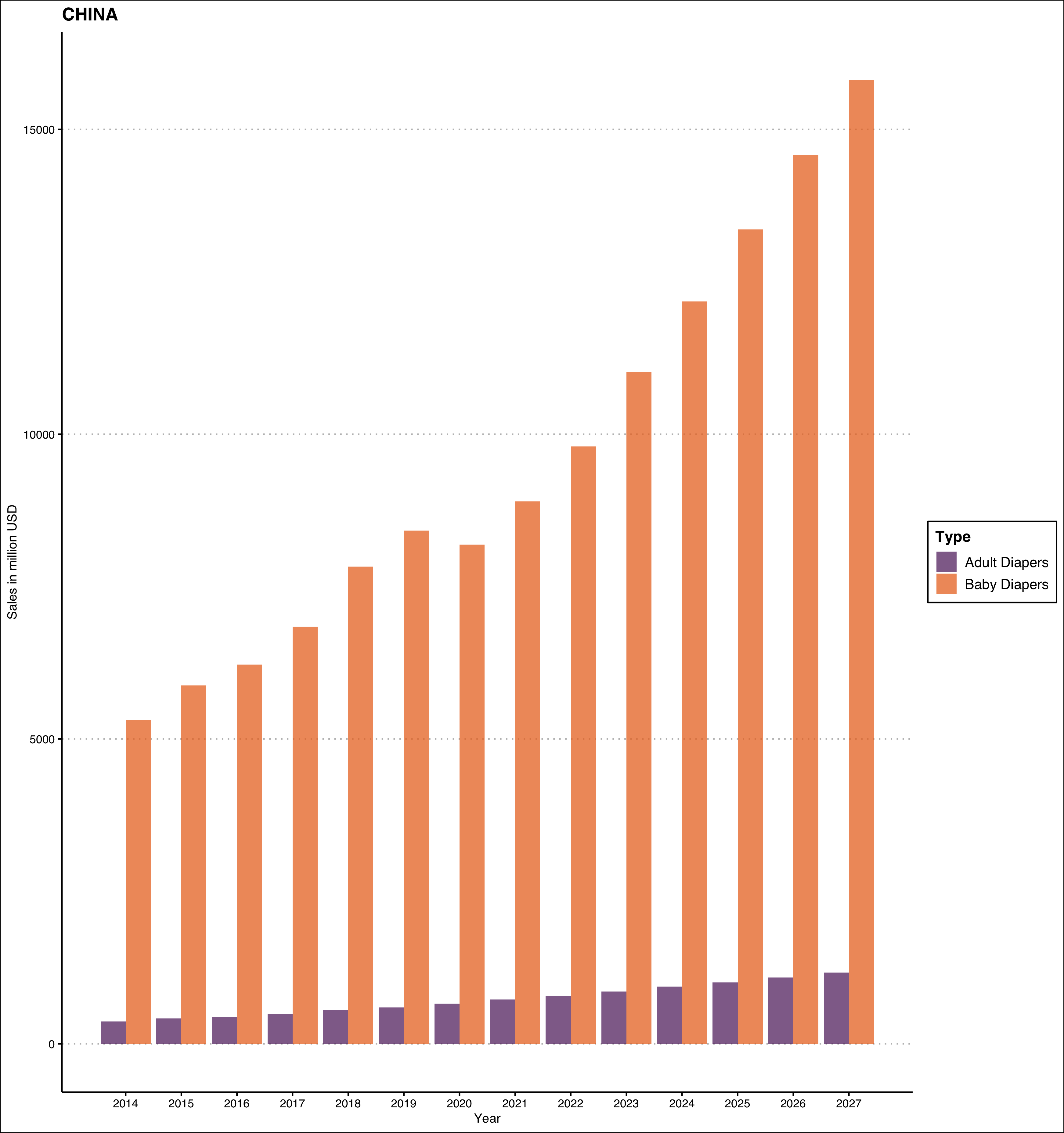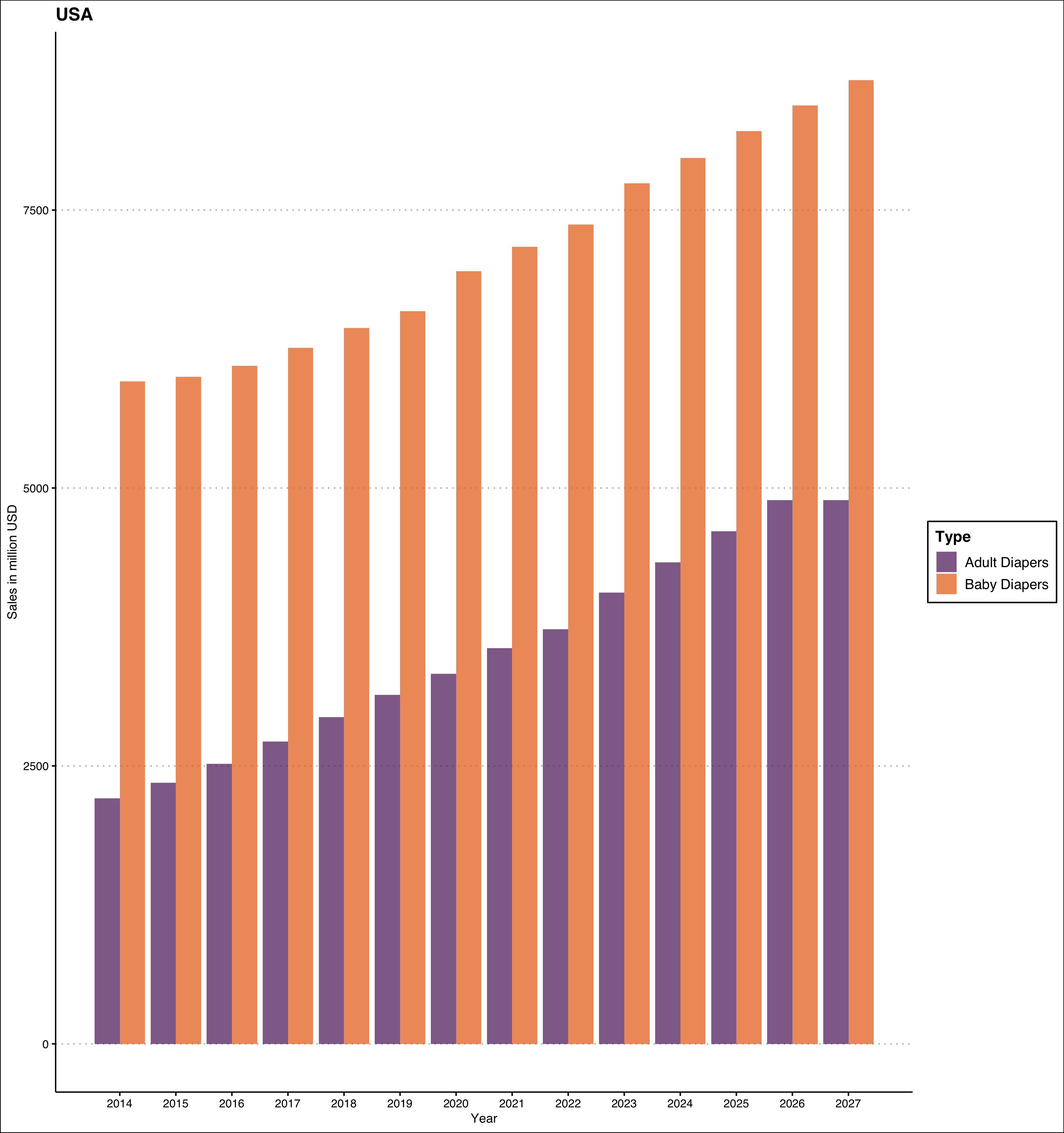 Both are growing, but it is clear that adult diapers is growing faster. USA’s absolute sales volume is much higher for a country of 331 million.