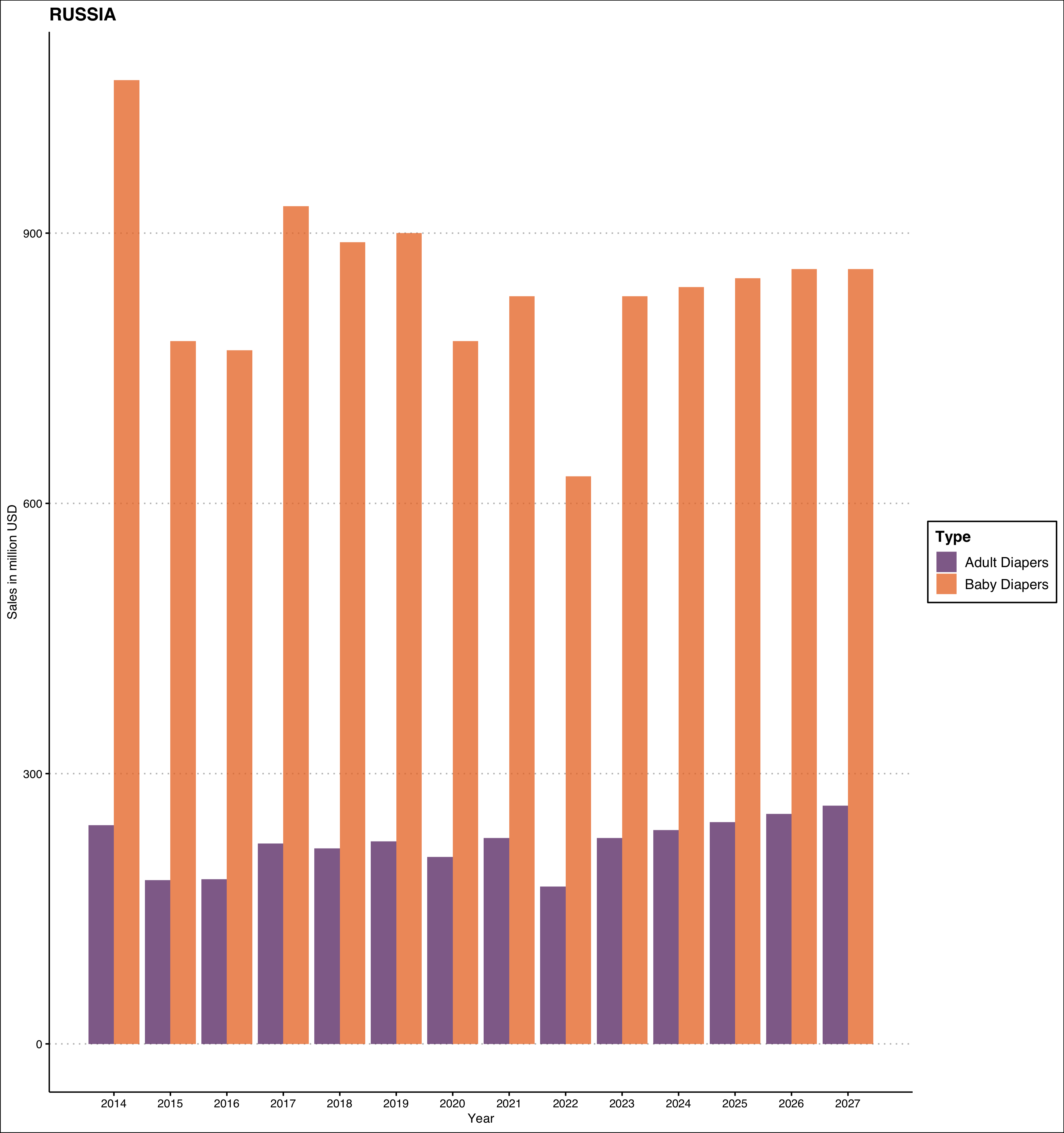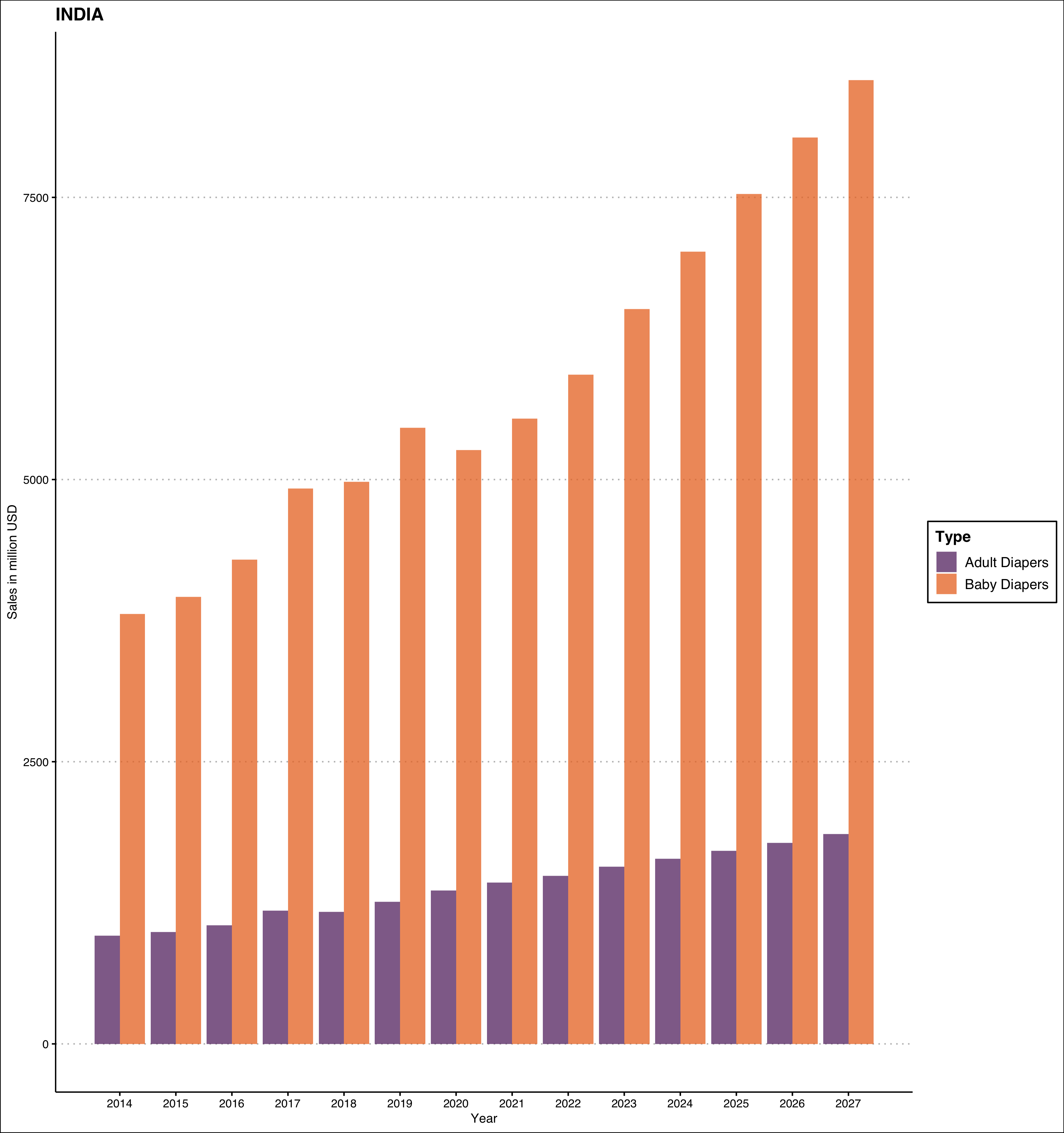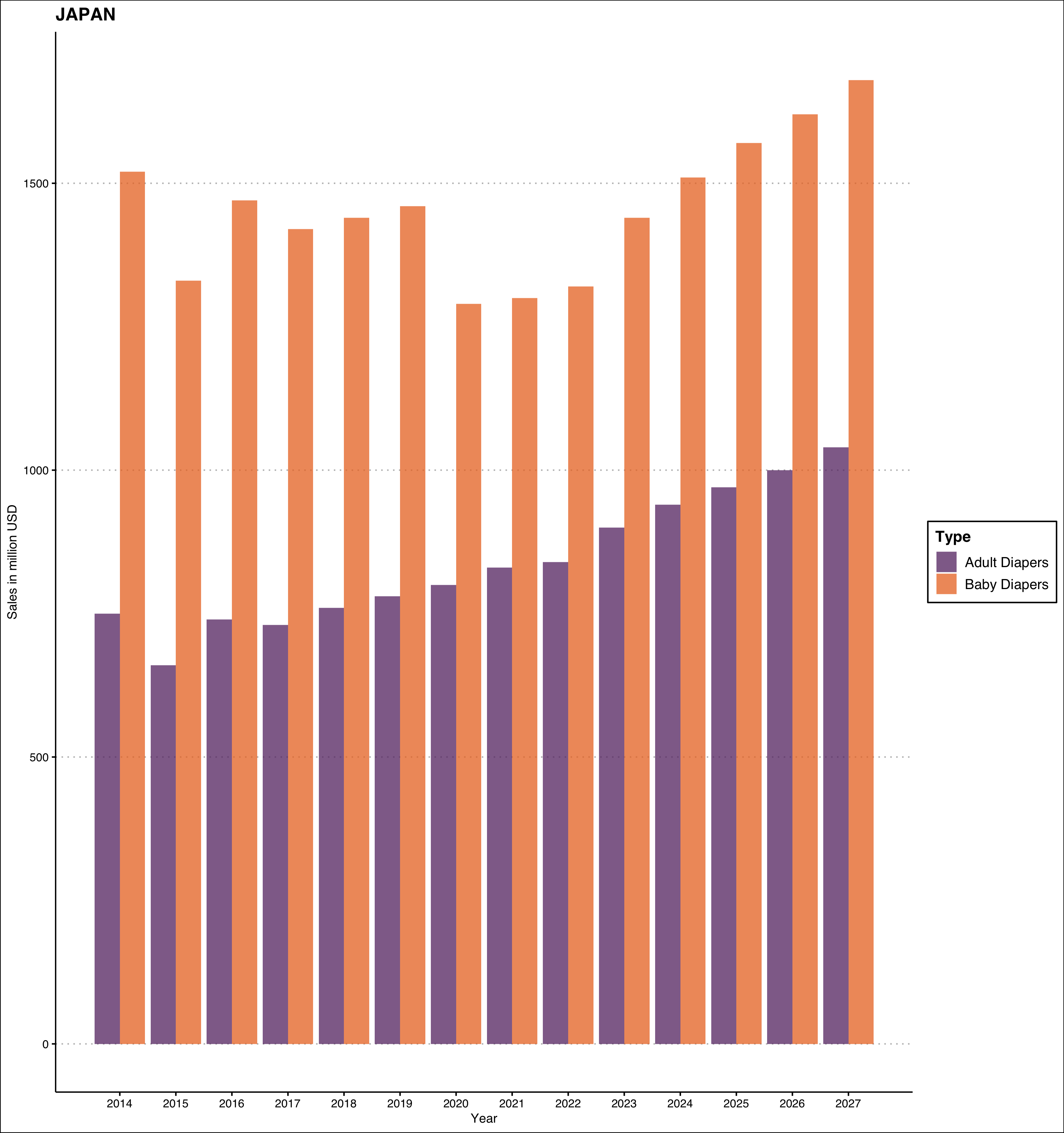 With this caveat in mind, let us get down to exploring these numbers as a time-series. The orange bars represent sale of baby diapers in millions of USD, while the purple bars represent sale of incontinence or adult diapers.2
