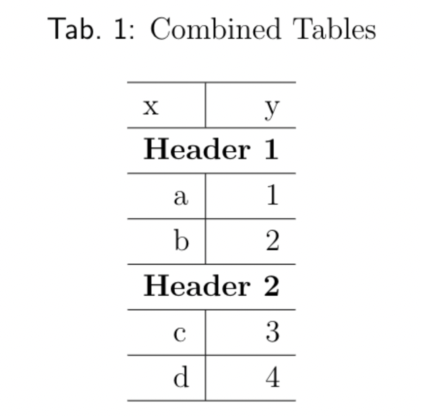 \caption{(#tab:unnamed-chunk-21)Combined Tables} \centering \begin{tabular}[t]{l|r} \hline x & y\ \hline \multicolumn{2}{l}{\textbf{Header 1}}\ \hline \hspace{1em}a & 1\ \hline \hspace{1em}b & 2\ \hline \multicolumn{2}{l}{\textbf{Header 2}}\ \hline \hspace{1em}c & 3\ \hline \hspace{1em}d & 4\ \hline \end{tabular} \end{table}