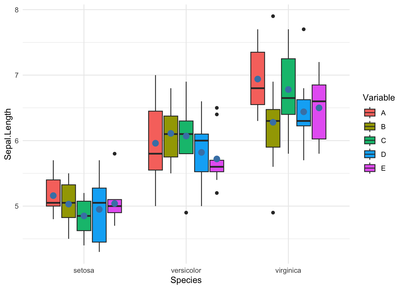 ggplot(aes(x = Species, y = Sepal.Length, fill = Variable)) +
